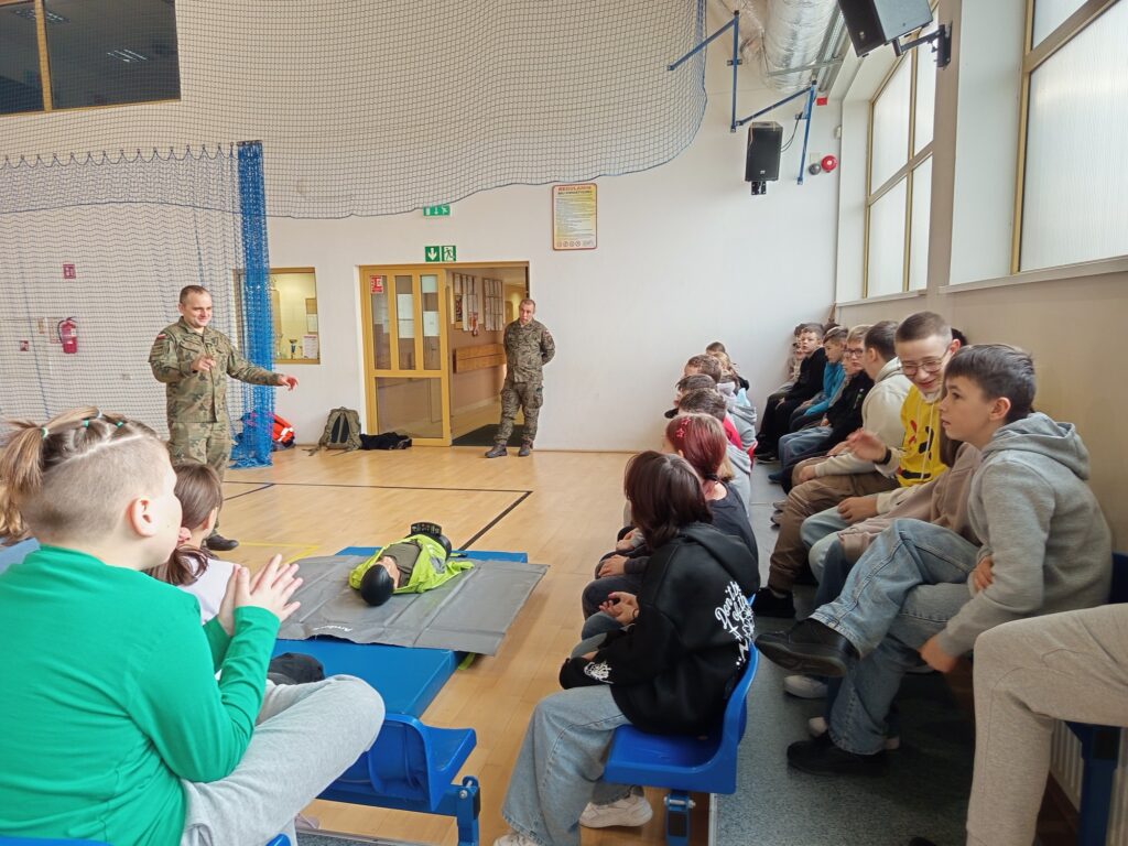 ≤Uczniowie z zaciekawieniem słuchali prowadzących, odpowiadali na pytania. Ponadto niezwykle duże zainteresowanie i wiele pozytywnych emocji wzbudziła degustacja poszczególnych elementów racji żywnościowych wojska. W końcowej części zajęć uczniowie mogli również sprawdzić oraz dopracować swoje umiejętności praktyczne w zakresie udzielania pierwszej pomocy przedmedycznej.